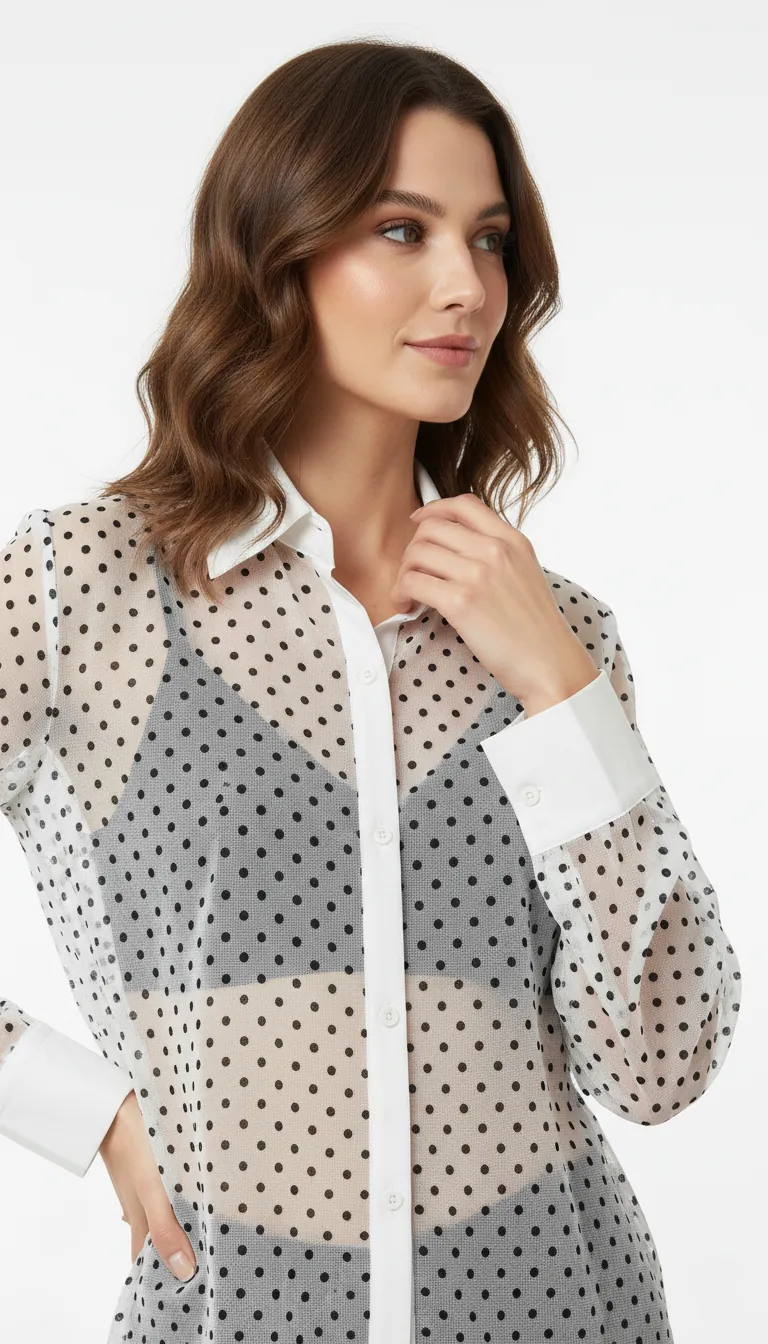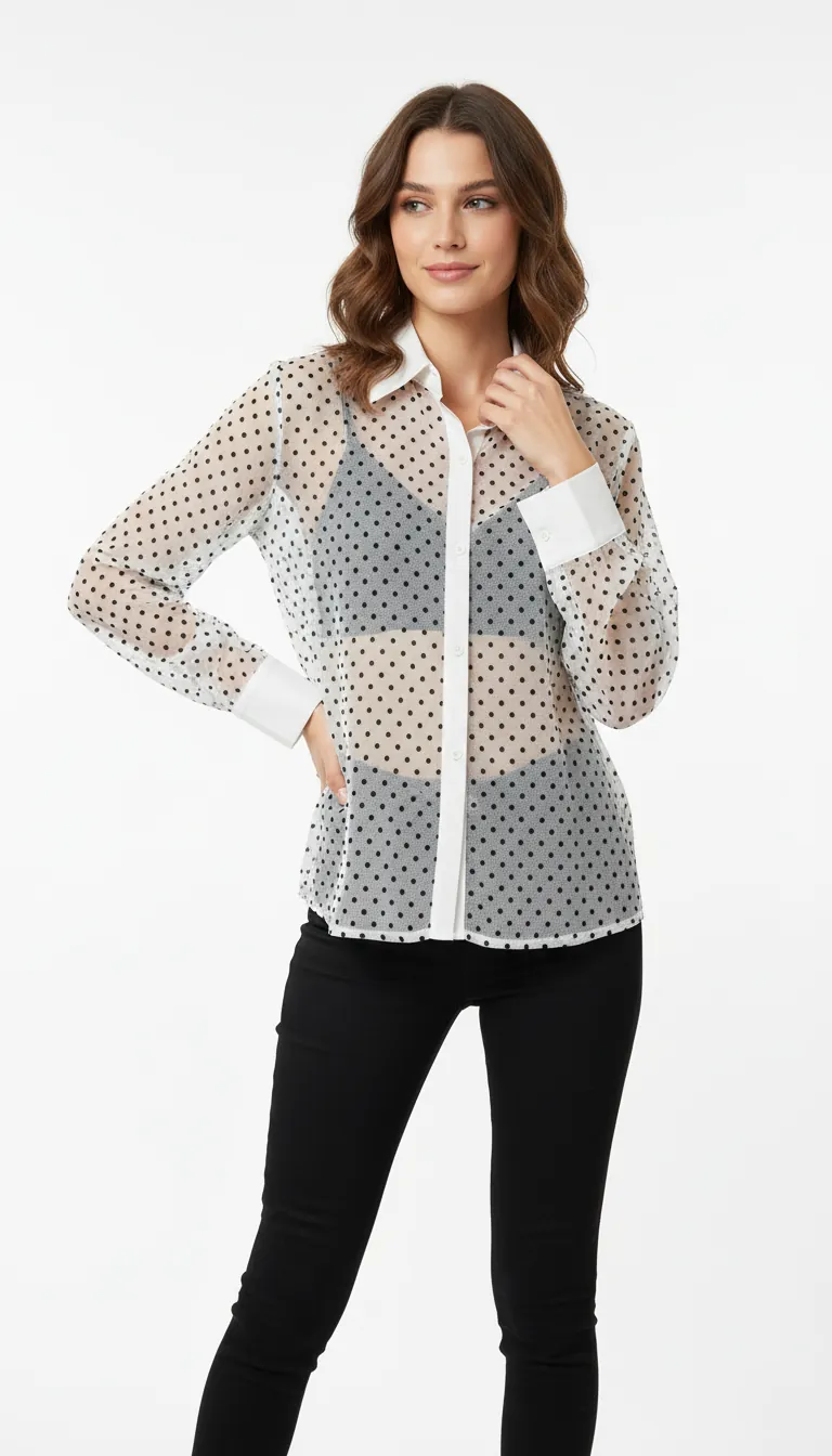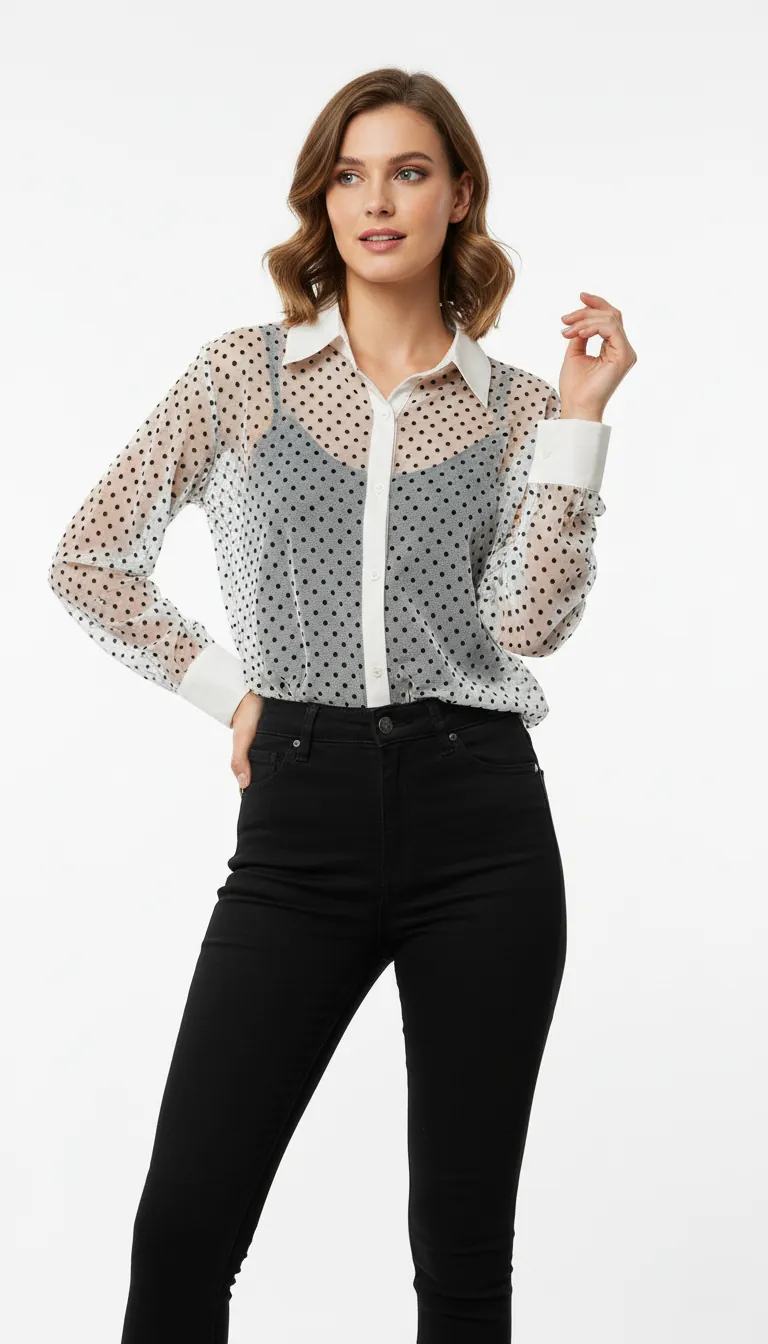Ce chemisier transparent à pois noirs est facilement versatile. Portez le avec un débardeur contrasté en dessous pour un look discret ou osez la transparence gracieuse pour rehausser votre audace. Il s’harmonise parfaitement avec des accessoires minimalistes ou des bijoux plus volumineux, permettant d’adapter votre style selon vos envies. Faites de ce chemisier la pièce maîtresse de vos tenues, que vous soyez adepte des looks classiques ou modernes.