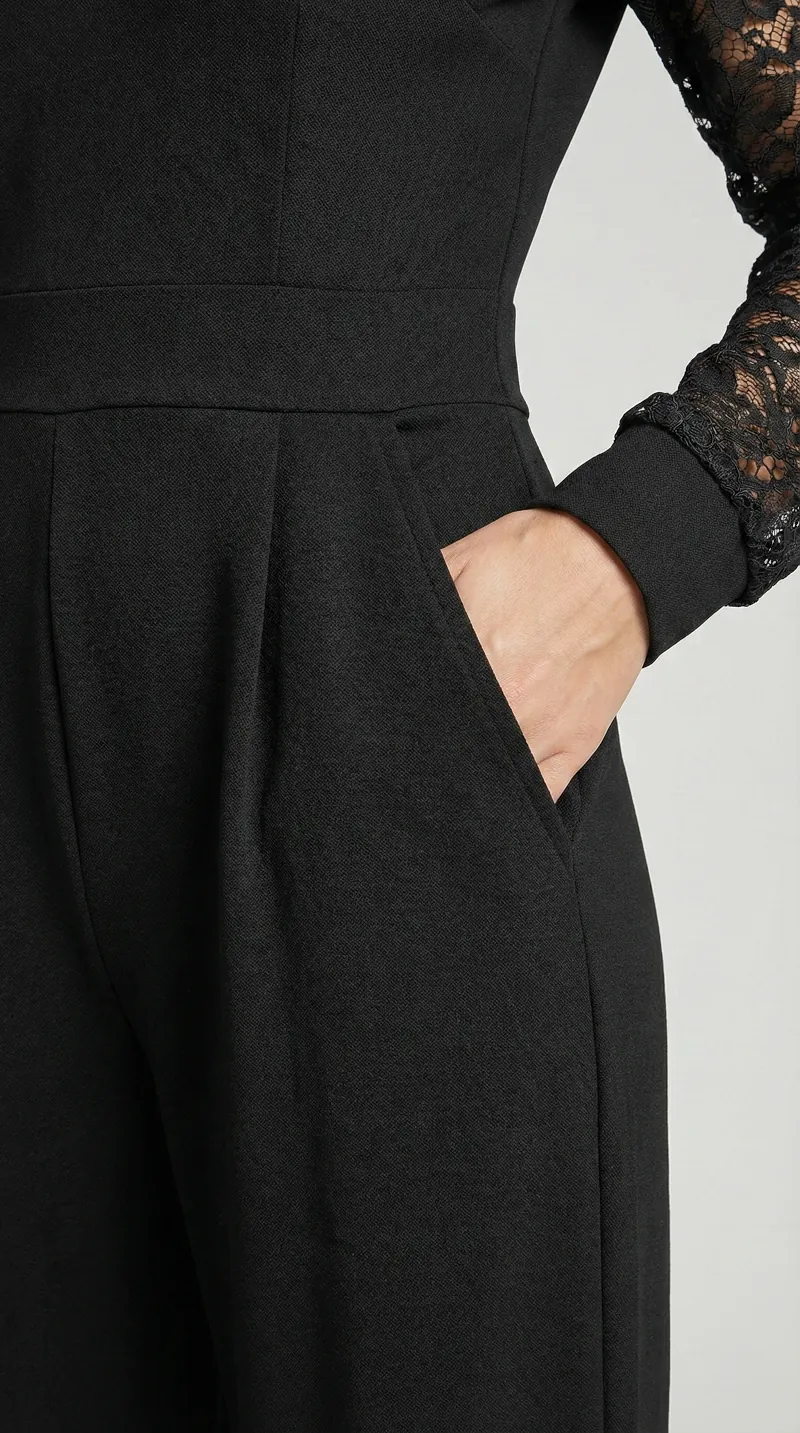 Fabriquée à partir de tissus de qualité premium, cette combinaison garantit douceur et durabilité. La dentelle élégante présente sur les manches apporte une touche unique et raffinée, ajoutant un contraste subtil mais charmant au design sobre de la tenue. La couleur noire intemporelle permet de facilement l’associer à divers accessoires et chaussures pour personnaliser votre style.