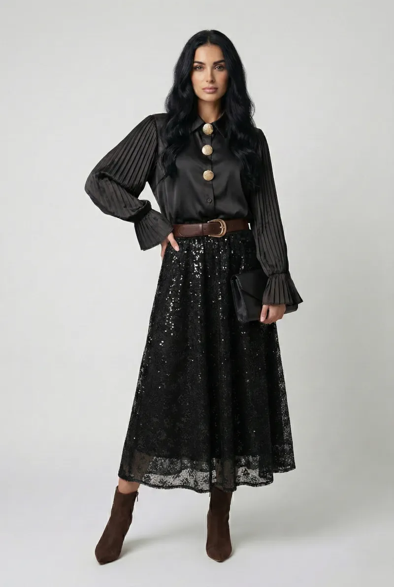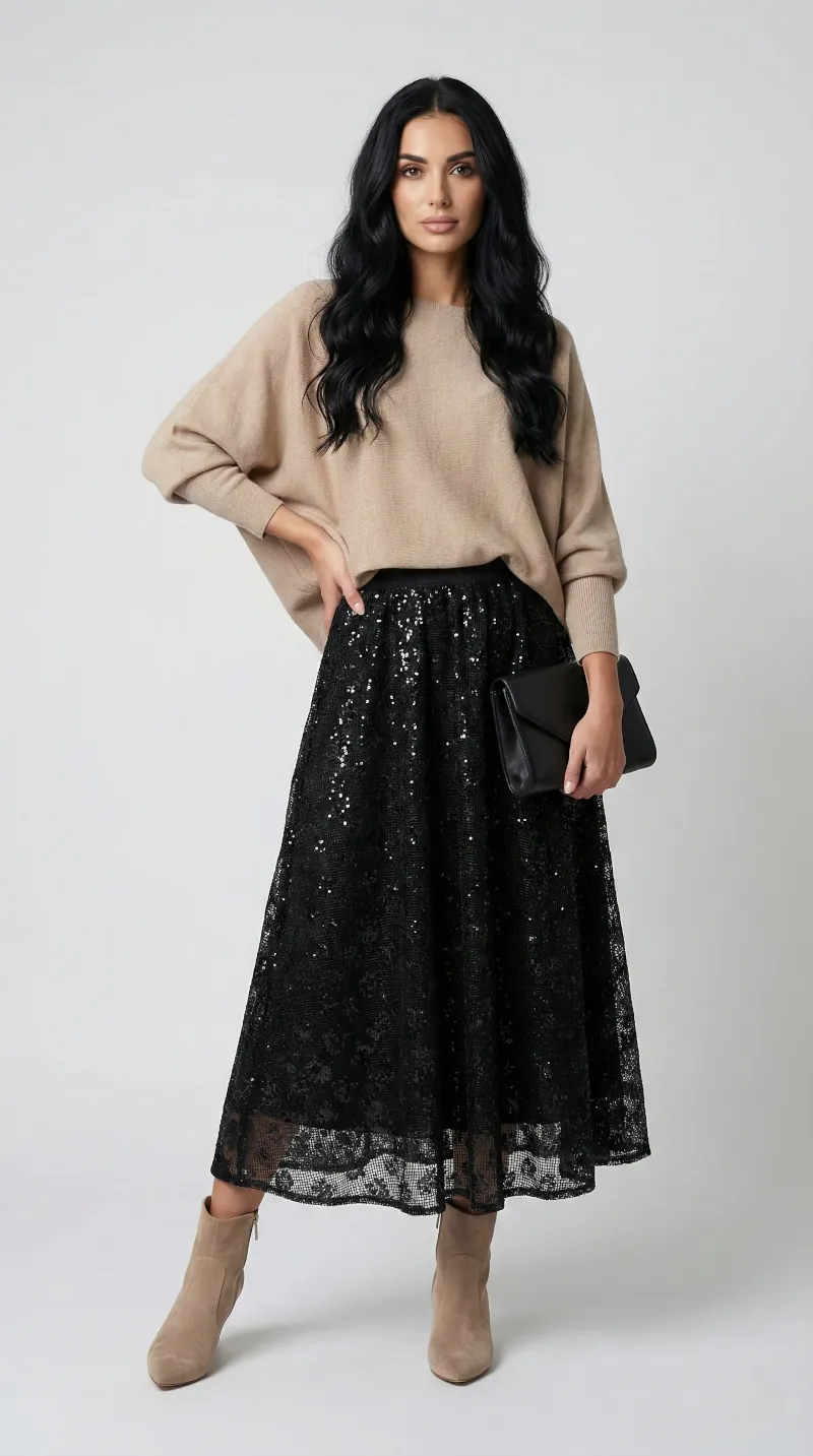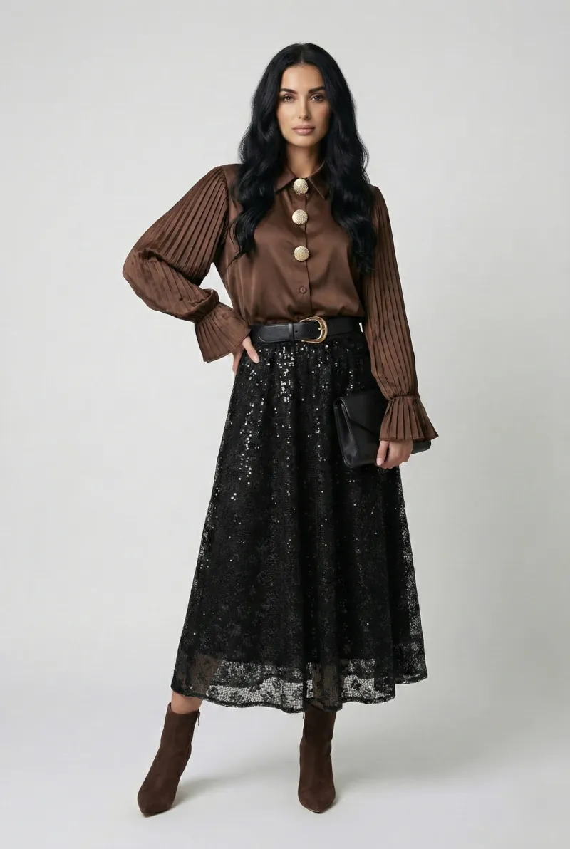 Avec son design soigneusement pensé, cette jupe est parfaite pour une variété d’occasions — des soirées élégantes aux événements spéciaux. Les sequins en fleurs reflètent délicatement la lumière, ajoutant une touche de brillance qui attire l’attention sans être ostentatoire. Sa longueur confortable lui confère un look chic adapté à tout moment, et son tissu de qualité premium garantit un port agréable tout au long de la journée ou de la soirée.