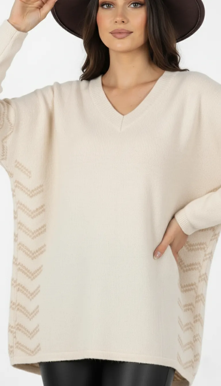 Pull ample femme col V en maille douce avec bandes latérales et manches en dentelle délicate et raffinée.