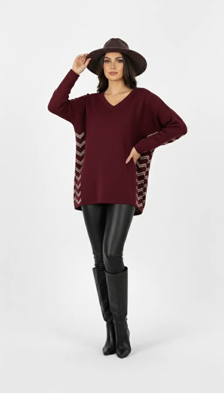 Avec son col en V qui flatte votre silhouette et son design ample qui s’ajuste à de nombreuses morphologies, ce pull est une pièce polyvalente que vous pouvez facilement intégrer à diverses tenues. Portez-le avec un jean pour une allure simple mais élégante ou associez-le à une jupe pour une apparence plus habillée. Les bandes latérales apportent une touche de modernité, tandis que les manches en dentelle raffinée créent une parfaite harmonie entre casual et chic.