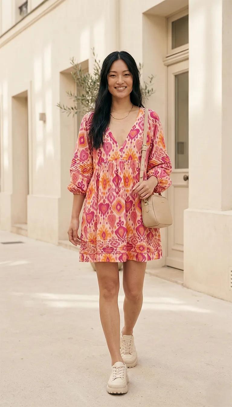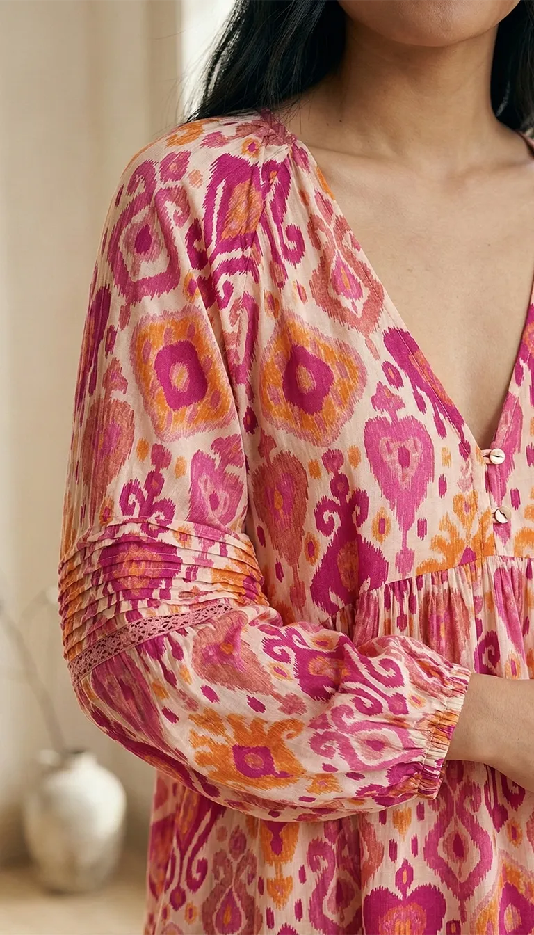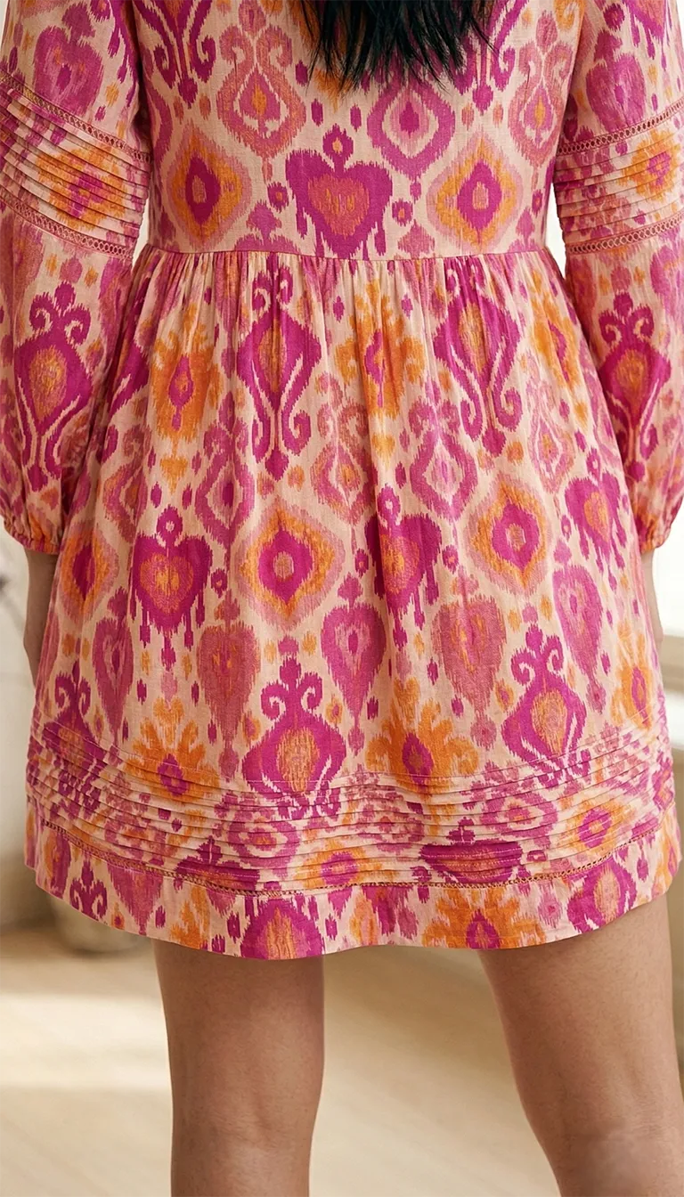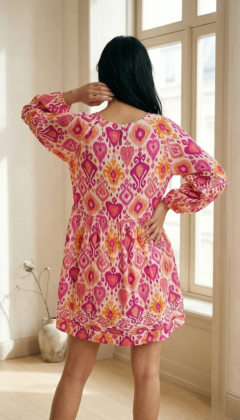 Robe Courte Bohème Imprimé Ikat Rose et Orange – 100% Viscose