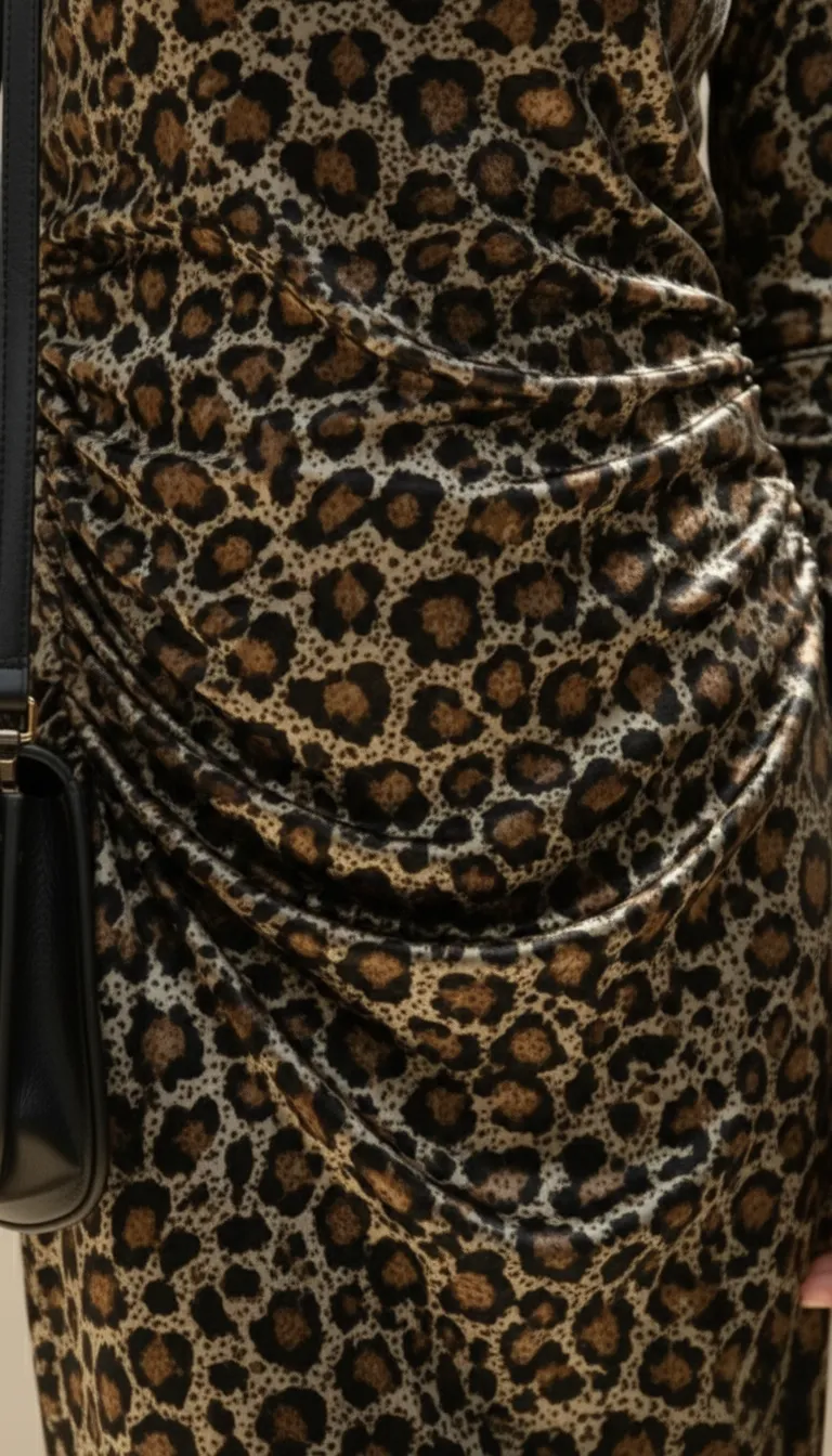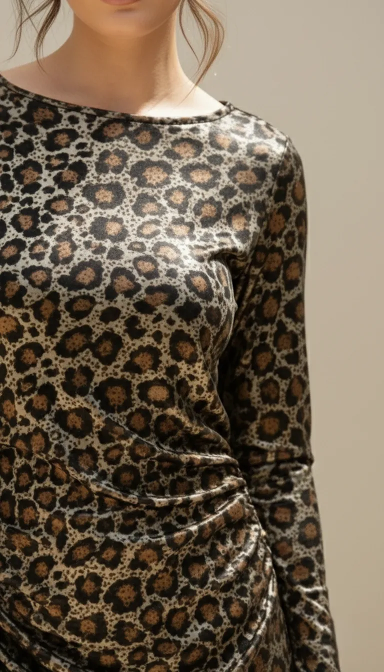 Une pièce magnétique où le motif animalier rencontre l’éclat du bronze métallisé. Sa coupe drapée sculpte la silhouette .