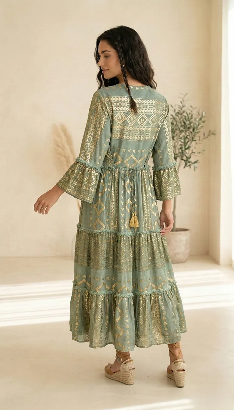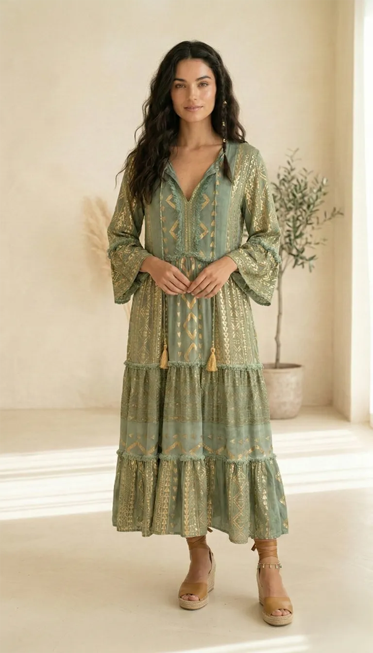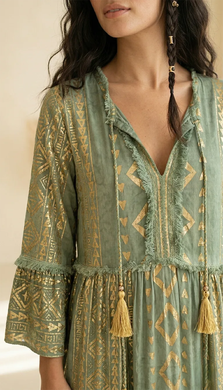 Découvrez notre robe longue vert sauge. 100% viscose, broderies or et pompons. Un look boho-luxe parfait pour toutes les occasions. Livraison offerte. Affirmez votre style avec cette pièce d’exception alliant confort absolu et finitions haute couture. Conçue dans une viscose de qualité supérieure, cette robe longue se distingue par sa teinte vert sauge apaisante, rehaussée de motifs d’inspiration ethnique et de broderies au fil d’or.