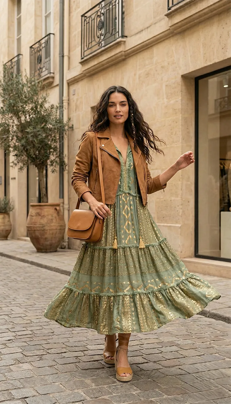 Le Look City-Chic : Comme sur nos photos, associez-la à une veste courte en cuir camel ou en daim et des espadrilles compensées pour une allure élégante en ville.